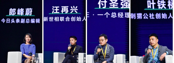 图:今日头条副总编辑郎峰蔚、新世相联合创始人汪再兴、ONE 一个总经理兼COO付圣强、刺猬公社创始人兼CEO叶铁桥(从左至右)