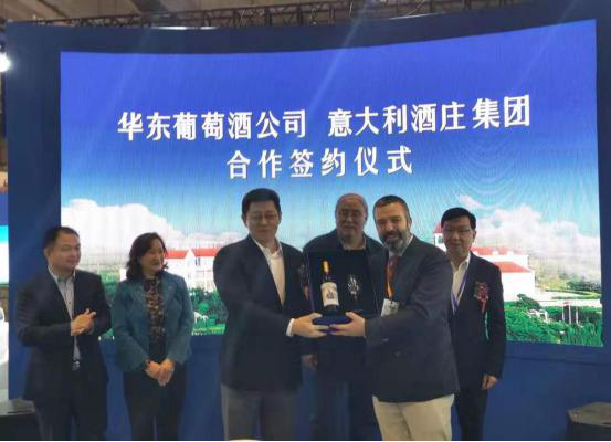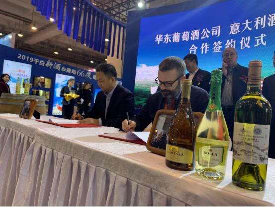 开幕式结束后,来自青岛市相关部门领导、协会代表和行业精英纷纷驻足在华东展位,共同鉴证青岛华东葡萄酿酒有限公司与意大利红酒集团签订战略合作协议。作为意大利精品葡萄酒的领导者和全球生产和销售优质精品葡萄酒的先驱者,GIV集团在意大利最负盛名的葡萄种植区拥有15个酒庄,集团拥有18个酒庄和罐装线,产品销往全球88个国家和地区。在前不久刚刚举行的中国进口博览会上,GIV集团的展台作为意大利参展的主要展台亮相,引起国家重要领导及相关部门的高度重视。此次双方的强强携手是将中国进口博览会开放的精神带到了青岛,将东西方的葡萄酒文化融会贯通,开辟了未来合作的无限可能。在青岛市相关领导的共同鉴证下,青岛饮料集团相关领导与GIV集团高管共同举杯2019华东·百利酒庄干白新酒,庆祝这令人激动的时刻!