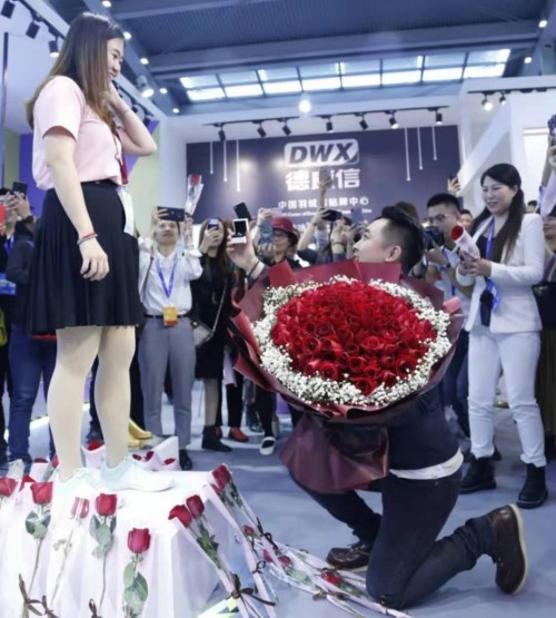 在展会现场,动情的一幕正在发生:德威信的一位核心成员向他的女友展开了颇具创意的求婚,引发了观展嘉宾们热烈的喝彩与祝福,使展览的气氛达到高潮。他表示德威信既是事业,也成就了幸福的生活。我们相信,他与爱人的未来,一定会像德威信一样充满希望,不断创造辉煌!