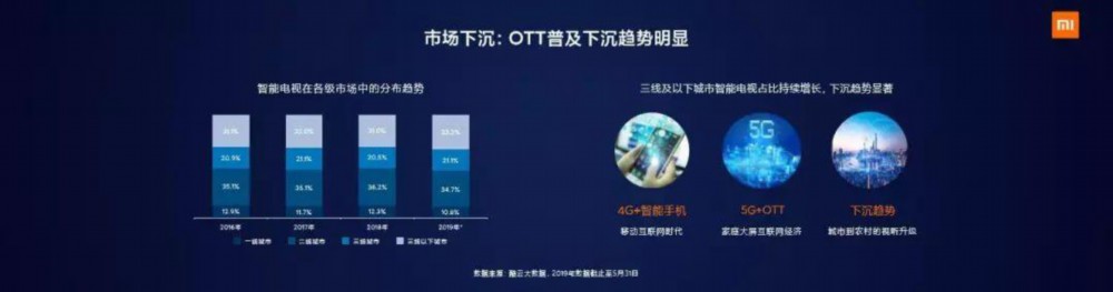 OTT普及下沉趋势明显。数据显示,三线及以下城市智能电视占比持续增长,下沉趋势显著正如4G+智能手机带动了移动互联网的发展,5G+OTT将继续下沉,将撑起家庭大屏互联网经济。