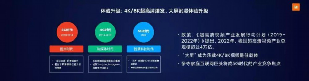 4K/8K超高清爆发,大屏沉浸体验升级。政策:《超高清视频产业发展行动计划(2019-2022年)》 提出,2022年,我国超高清视频产业总规模超过4万亿。新的视听体验将改变营销与用户的沟通方式,现新的家庭互联网巨头即将产生。