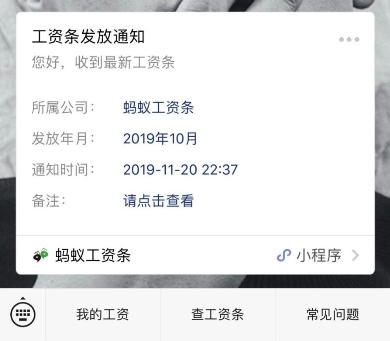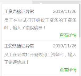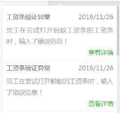 蚂蚁工资条3.2版本在11月28日正式上线了!新版本的蚂蚁工资条在可以轻松实现1键发送万人,1秒完成发放工资条的基础上,增加了工资条异常验证报告的新功能:该功能是当员工在查看工资条的过程中,输入的验证信息有异常时,给HR发送的异常提醒,HR可以通过提醒中的查看详情,来查看员工验证的异常原因。