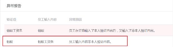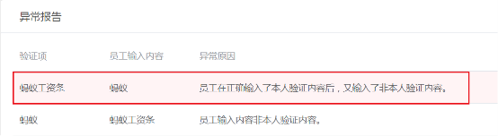 第四步:点击提醒下的查看详情。HR就可在异常报告中查看具体异常原因。此时异常原因高亮显示:员工在正确输入本人验证内容后,又输入了非本人验证内容。