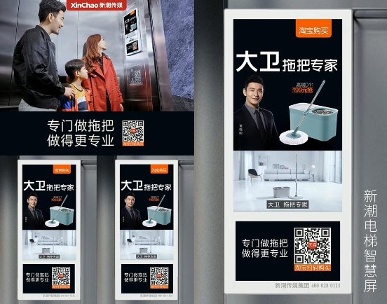 “产品卖到家,广告投新潮”。新潮传媒作为专注中产家庭消费的社区媒体平台,通过覆盖2亿中产家庭人群的70万部电梯智慧屏,全力助推大卫拖把的品牌影响力和销量提升,领跑拖把行业新升级,打造社区家庭消费领导品牌。