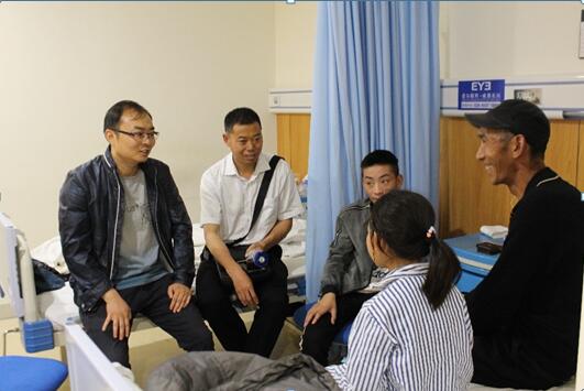 当地扶贫干部在病房看望阿苦一家(左:广汉市公安局陈警官)