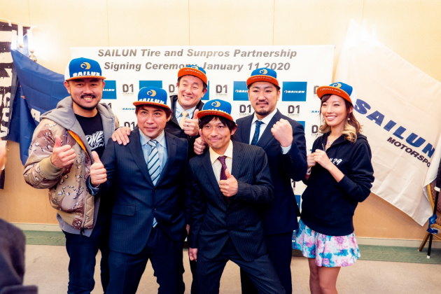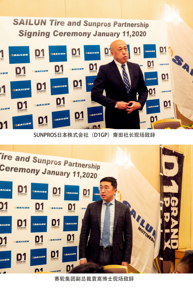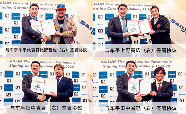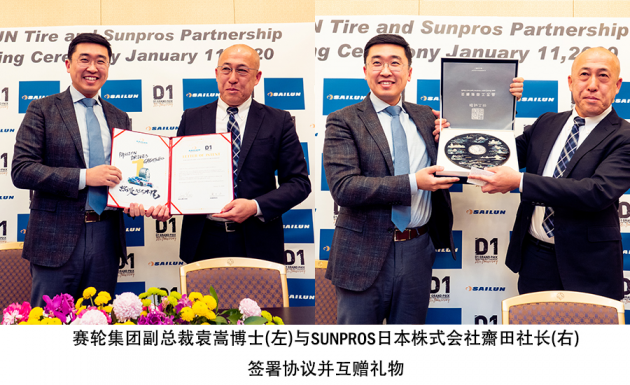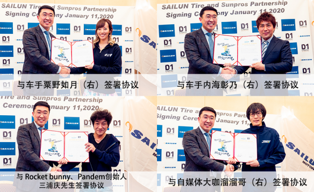 2020年1月11日,东京改装展(Tokyo Auto Salon)期间,赛轮集团与日本著名飘移赛事D1GP举行签约仪式,赛轮轮胎成为D1GP官方战略合作伙伴及D1官方轮胎供应商。SUNPROS日本株式会社齋田社长、赛轮集团副总裁袁嵩博士、赛轮集团总裁助理 亚太区总监汪久尚、赛轮集团运动轮胎销售总监陈峥,日本著名飘移车手日比野哲也先生、内海彰乃先生、畑中真吾先生、上野高广先生、田中省己先生、栗野如月女士、三浦庆先生(Rocket bunny、Pandem创始人,全球汽车改装大师)和国内自媒体大咖溜溜哥等出席了本次签约仪式。