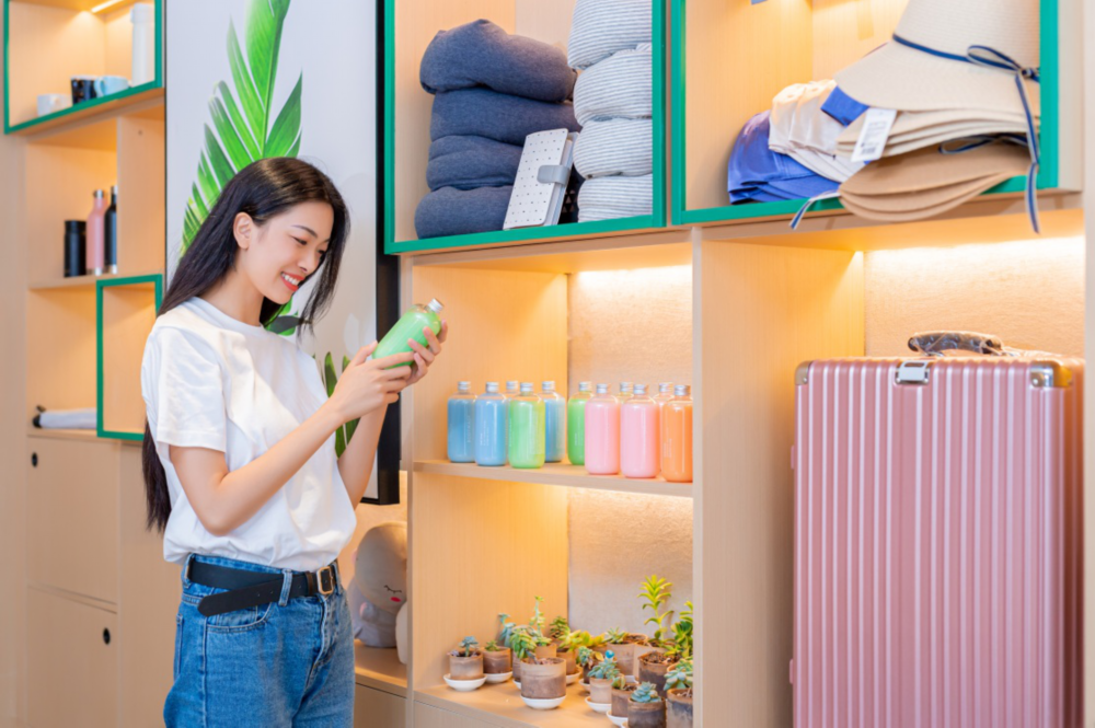 除了满足住客基础的睡眠和办公需求,为提升旅居生活的便利,尚客优品还创新提出了“酒店+新零售”的服务模式,即在大厅和客房内植入优选好物,包括旅行、家居和办公用品,通过场景化设计,打造一站式购物场所,住客不出酒店即可快速购买到日常生活用品,解决因临时出差准备不足而造成的窘迫感;此外,酒店还增加轻社交、书吧、自助洗衣等便捷的生活空间,致力于营造丰富多元的旅居体验。