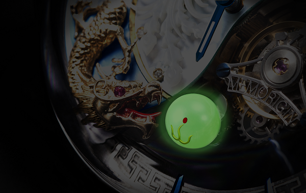 表面以天地为背景,参考中国明代末、清代初的宫廷雕刻打造的18K金立体金龙栩栩如生,从水底探出头;于中心盘旋的“火凤”以精湛的浮雕技术,勾勒出祥和神色,镶嵌于离表面半毫米的位置,呈现在空中飞翔的景象。腕表8时位置,以极精密的技术把日本阿古屋珍珠掏空,加入数条目前世界最强光的高科技氚气管,于直径只有5毫米的空间放入足足9件零件,令“内丹”在漆黑中散发光芒,再现了“龙吐珠”的传说!“内丹”以每60秒转一圈的速度转动,与置于6时位置的飞行陀飞轮相辉映。陀飞轮每小时振频达28800次,更配合72小时动力储存。内丹如轮转动,周而复始,寓意福寿无疆。