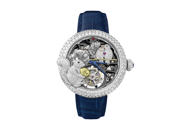 LOVE LOVE COLLECTION- Friends则以18k白金打造的松鼠和一双爱情鸟为主角,饰以18K黄金的松果及树枝,小松鼠手捧其喜爱的松果,而爱情鸟成双作对的互相依偎,中间加入抢眼的“爱心”,整个画面洋溢著幸福的感觉。镂空精钢表盘加入立体牡丹花雕刻图案,背景低调地展示出精密的机芯零件运作。此款腕表选用了永不过时的圆形腕壳,可爱的松鼠置于表壳之上,令设计更突出。指针和表带均选用优雅的蓝色,闪烁的美钻与6时位置的陀飞轮互相辉映,绽放高雅气质。万希泉为此系列腕表挑选了振频每小时达28800次的陀飞轮,走时稳定、精准,配合72小时动力储存机芯,令腕表真正做到内外兼备。
