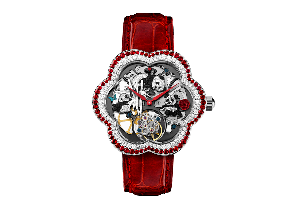 LOVE LOVE COLLECTION- Family以中国国宝熊猫为灵感,腕表面上有三只以黑白美钻铸造的熊猫,表盘则采用了万希泉最擅长的镂空雕刻技术打造茂密的竹林,让熊猫可以悠闲地享受大自然的乐趣。3时和9时位置上,分别饰以珍珠贝母打造的牡丹花和蝴蝶装饰作点缀,12时位置加入爱心图案,增强了腕表的层次感。腕表特地选用了富有中国色彩的茶花形表壳,表壳上饰以一圈红钻及一圈白钻,搭配鲜红色的指针及鳄鱼皮表带,雍容华贵。腕表配备60小时动力储存陀飞轮机芯,满足女士们的使用需求。