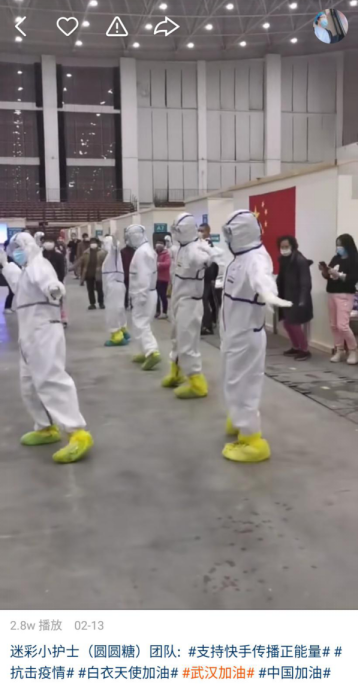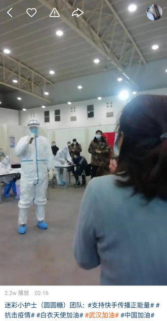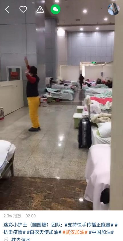2月9日,快手用户“迷彩小护士(圆圆糖)团队”(快手ID:PAP88999)上传了一段武汉方舱医院的短视频。会展中心被一人多高的白板子分隔成好多间病房,每一间门口的木头桌子后都坐着位全副武装的护士。患者们有的窝在床上玩手机的,有的穿着厚厚的居家服遛弯,还有位闲不住的大妈独自起舞。