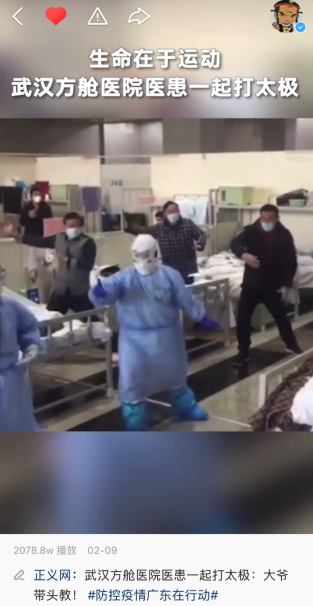 为了拍这段短视频,患者谈女士还专门用播音腔配了旁白。接受采访时她说:“医护工作者每天都很辛苦,我们就希望用这种方式互动,活跃下气氛。”同时,她也表示医生们都很好,既治我们的心又治我们的身,在他们的悉心治疗陪伴下,“我们都相信会很快出院的。”