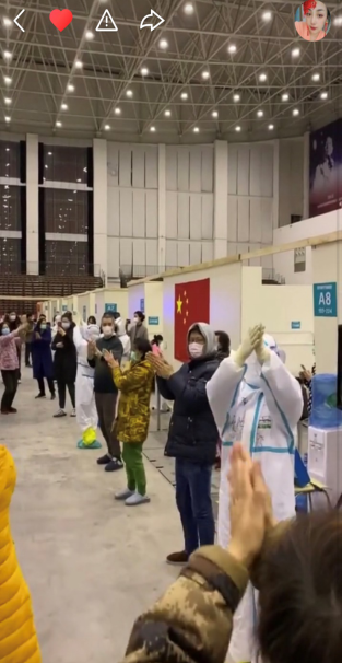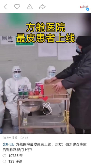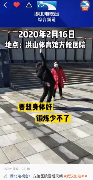 虽然方舱医院是集中收治轻度感染者的地方,但并不意味着大家必须关在病房里寸步不离。天气好的时候,患者也可以在病房外的隔离地带走动。洪山体育馆方舱医院的病患们常常三两结伴,在医院外的小广场上,晒晒太阳呼吸下新鲜空气。“伸伸胳膊,抻抻腿,经常锻炼身体好。”有老铁评论:“隔着屏幕都能感受到大家愉悦的心情,愿早日康复。”
