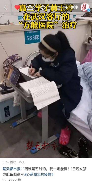 高三姑娘黄玉婷也住进了方舱医院,她每天坐在病床上通过平板电脑在线上网课。床头的书包里装着厚厚一摞习题。她和护士说,“困难是暂时的,我一定能赢。”