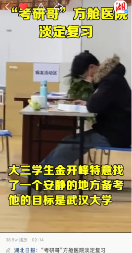 在武汉体育中心方舱医院,接受治疗的大三学生金开峰正在复习考研英语,他的志愿是武汉大学新闻传播专业,这是准备好要当“清流读书哥”的学弟了。