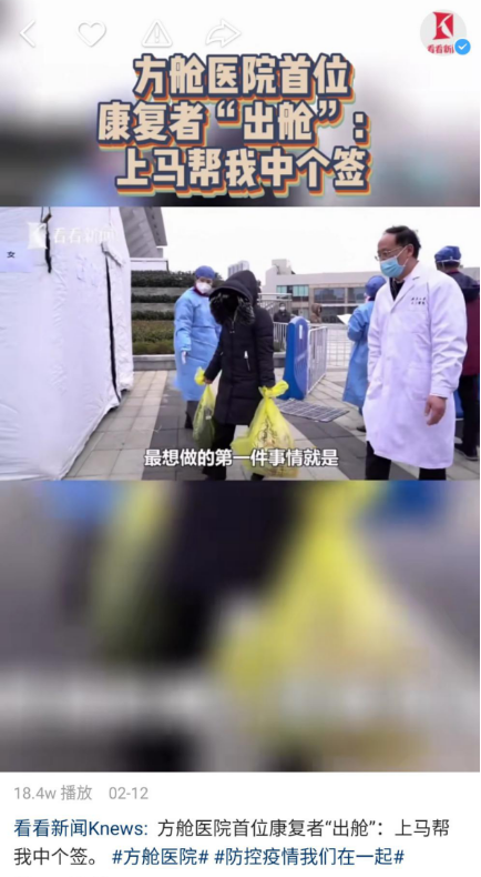 2月15日,武汉客厅方舱医院首批17位患者出院。武汉大学中南医院副院长、武汉客厅方舱医院副院长李志强表示:自2月7日开舱正式收治病人,已过去一周时间,很多病人经过治疗后,都处于稳定再到恢复的状态。最近几天应该会是方舱医院出院的第一波高峰期。好消息接踵而至,网友纷纷发来祝福,“祝方舱医院早日关门大吉”。