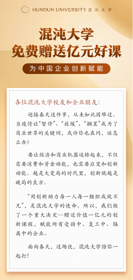 此外,作为“中国创新力传播者”,混沌大学积极输出自身的课程能力,满足企业在疫情期间的创新需求。1月30日,混沌大学免费赠送系列好课,并向所有人开放,涵盖幸福心理、中国经济、世界未来以及工作职场等,每天一个主题,陪伴国人在家看课,向内认知;2月,上线“免费学习月公益活动”,面向湖北免费开放【研习社】课程。