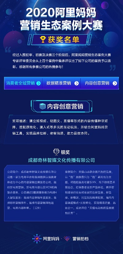 2020年3月26日,备受关注的2020阿里妈妈营销生态案例大赛获奖名单终于揭晓,成都奇林智媒文化传播有限公司凭借出色的案例——"拖把的革命--蒸汽拖把超级品类日整合营销方案"获得了本次大赛“内容创意营销”银奖。