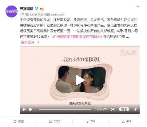 4月7日,天猫国际官方发起活动,发布自带BGM的魔性病毒视频,多位网红明星、美妆类KOL接力活动助力造势,痛点场景的精准切入,BGM的神曲洗脑效果,引起了一大波年轻消费者的共鸣与关注,让很多网友直呼“扎心”,随后生出“你懂我”的感慨,实现自发传播扩散。