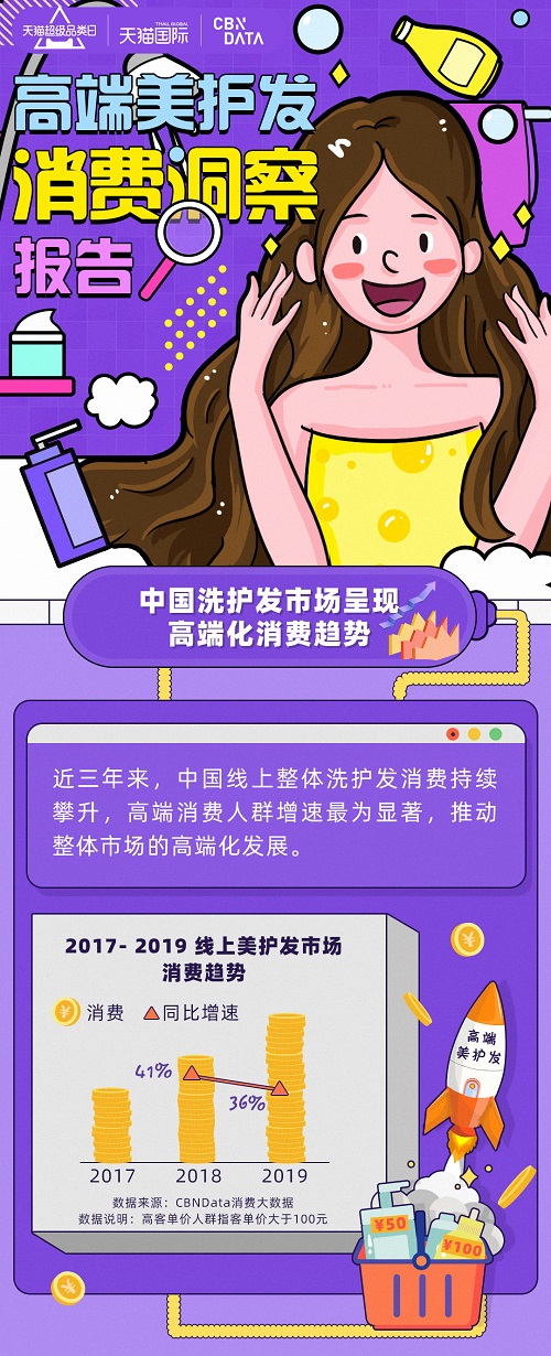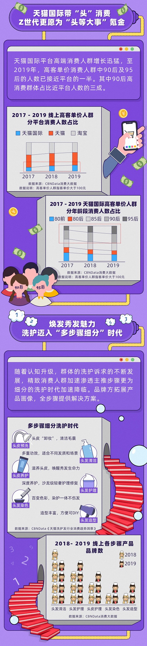 活动期间,CBNData联合天猫国际发布的《高端美护发消费洞察报告》中深入剖析了高端美护发的发展趋势。报告中指出,近三年来,中国线上整体美护发消费持续攀升,高端消费人群增速最为显著,推动整体市场的高端化发展。其中,Z世代更愿为“头等大事”氪金,至2019年,高客单价消费人群中90 后及95后的人数已接近天猫国际平台的一半。其中90 后高消费群体占比近平台人数的三成。