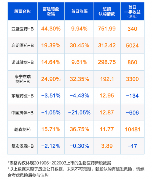 而近期认购倍数较高的几家未盈利生物制药公司,在上市首日都取得了非常亮眼的成绩,如诺诚健华、康宁杰瑞、启明医药、亚盛医药等等。