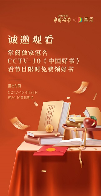 2019年度《中国好书》将于今年4月23日世界读书日当天在中央电视台十套20:10与大家见面,这也是中国数字阅读领军企业掌阅连续六年携手中央电视台,为好书搭台,并在晚会播出期间为全国读者发放阅读大礼包。