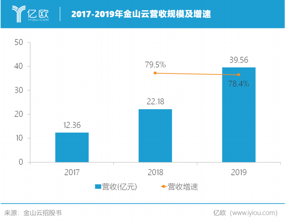 近年来,金山云的业绩表现同样堪称惊艳,2017年至2019年,其营收从12.36亿元增长至39.56亿元,复合年均增长率高达79%。这样的增长速率也远远超出了Frost &Sullivan数据显示的2015至2019年间云计算行业37.7%的整体增速。