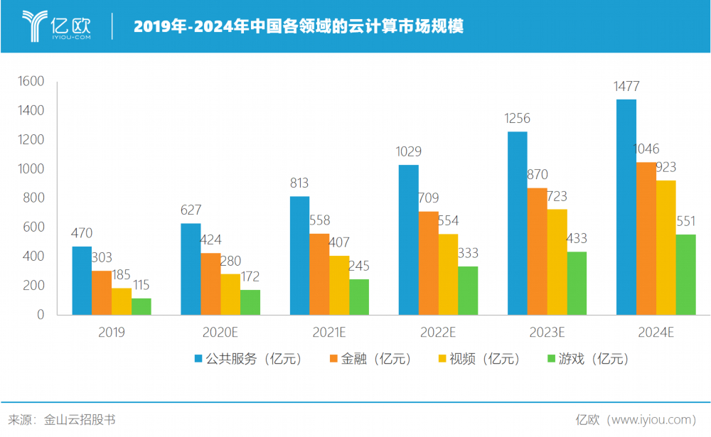 虽然游戏、视频等行业的市场增速依旧保持在30%左右,但企业级市场规模更为庞大。以金融行业为例,据Frost &Sullivan预测,到2024年,云计算在该行业的市场规模将达到1046亿元,而游戏和视频行业仅为551亿元和923亿元。