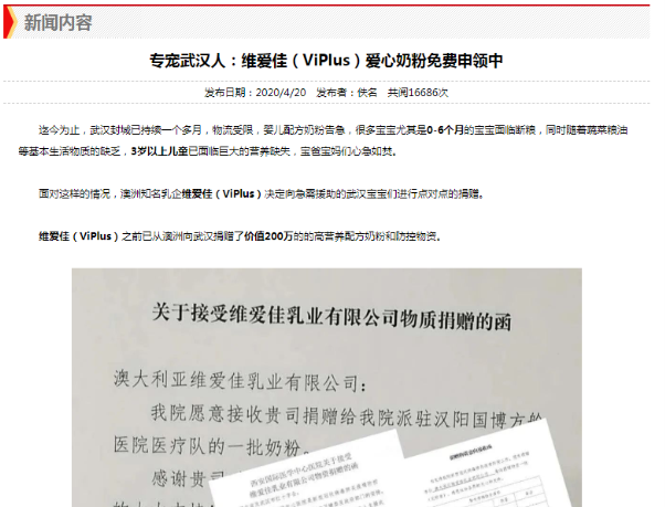 3月10日,维爱佳(ViPlus)发起了“专宠武汉人”公益活动,为武汉6000户家庭免费派发爱心奶粉,缓解了宝宝口粮短缺,贴心的举动引起各大媒体的关注,并为此做了广泛的新闻报道。
