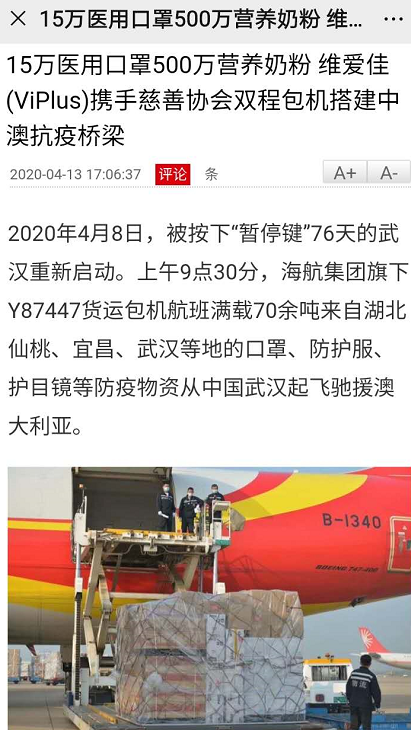 4月8日中澳联合包机:维爱佳(ViPlus)汇同国内爱心联盟支持全球抗疫,联合承包武汉解封后首架国际货运航班。这架从悉尼直飞武汉的双向包机满载着价值500多万的爱心物资,以及维爱佳(ViPlus)对湖北地区浓浓关怀的爱心从悉尼起飞,践行了 “联手行动,抗击疫情”的理念。