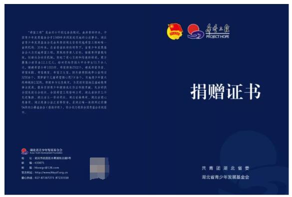 图为希望工程办公室及湖北省青少年发展基金会联合发布的捐赠证书