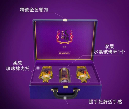 除此之外,在包装设计上毛铺酒也是精益求精,将微妙的档次感融入到每一个细节。其中毛铺紫荞酒以祥瑞的紫色作为主打色,呈现出礼品本该具备的高端大气和卓越的品质;外有金色锁扣作为点缀,内有柔软的珍珠棉用以托底,自内而外的高贵精致。