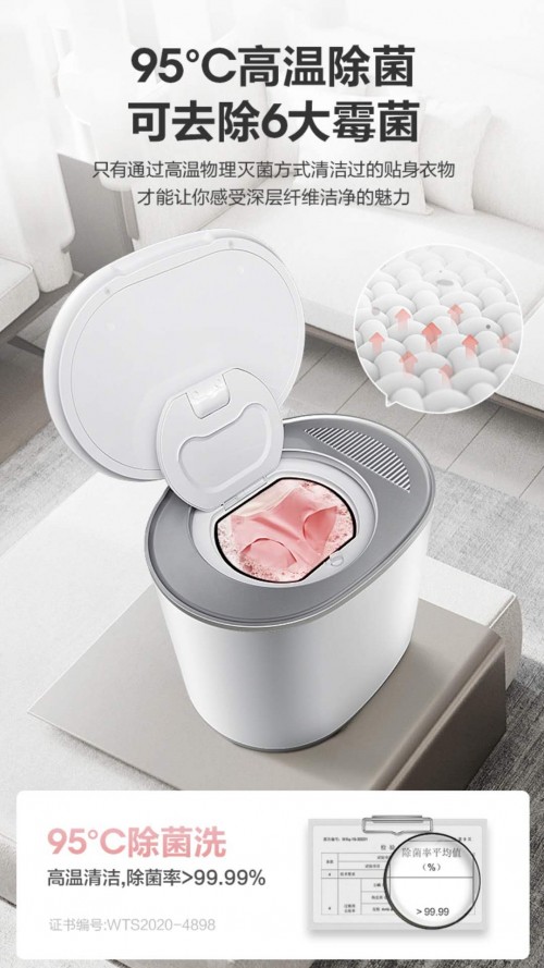 这款女神定制款洗衣机,体积较小,0.16平方米的占地面积,让它拥有“内衣胶囊”之称,小巧可爱不占地,对于小户型用户特别友好。除体积小外,它很多的细节设计,也让用户对其赞不绝口:双层防烫顶盖可以防止热水溅出;全不锈钢内筒设计,避免细菌滋生,卫生又耐用。1kg专属洗衣量,满足用户每天清洗内衣的需求,拒绝内衣堆叠累积,让内衣清洗更轻松、便捷。