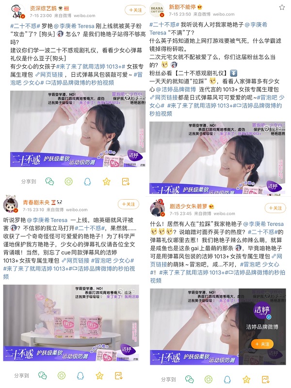 2、组织KOL将原生TVC与弹幕风姨妈巾包装结合,在微博发起一波”二十不惑观剧弹幕礼仪“,并同步投放信息流及评论流,圈定目标人群。