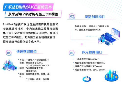 2020年9月1日,在中国数字建筑(全国)峰会2020上,广联达正式发布了施工建模设计软件BIMMAKE。该产品基于广联达自主知识产权的图形和参数化建模技术,是专为技术线工程师打造专注于整个施工过程的BIM建模设计软件而设计的。快速获取建筑的BIM模型,有助于建筑企业的精细化管理,提高建筑行业的整体数字化水平。