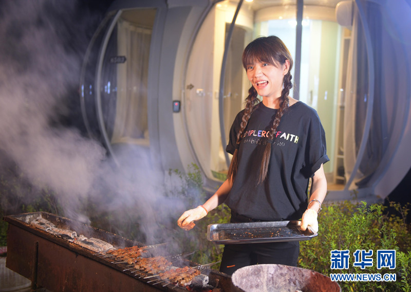 在抓吉赫哲民俗村体验动手烤串的乐趣。新华网发(王志富 摄)