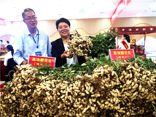 展台上,蒜香花生、芥末花生、话梅花生、原味花生等花生小零食琳琅满目。花生奶、花生露、花生酒、花生油等花生加工食品应有尽有。