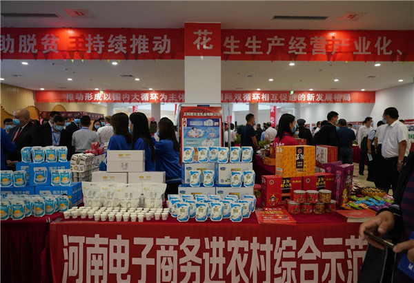 “这是刚刚炒出来的花生,香脆可口,请您品尝。”“这是水煮花生,五香的,回味无穷。”“这个是小包装,带上几包,感觉味道好了,网上有售。”在电商大集展区,热情的正阳农民向前来参会嘉宾一边介绍着以花生为主的农特产,一边让他们品尝。