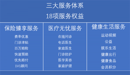 用户在平安健康APP参与“HRC健康信用体系”后,可享受平安健康APP提供的3大服务体系和18项服务权益。3大服务体系包括保险臻享服务、医疗无忧服务和健康生活服务,18项服务权益分属于这些服务体系下面,包括费率优惠、门诊津贴、百万赠险、快速预赔、在线问诊、家庭医生服务、门诊陪护、医学美容、运动视频、娱乐生活、健康食品等。