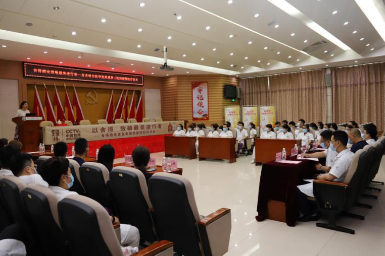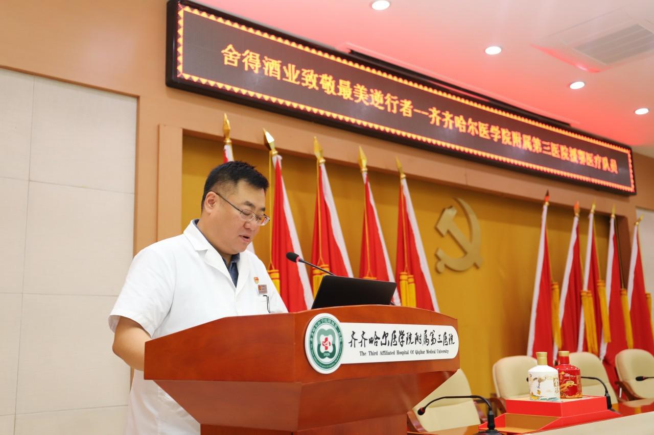 齐齐哈尔医学院附属第三医院院长、党委副书记孙兴元代表医院对援鄂抗疫医疗队员的工作情况作了简要介绍,并表示:“面对肆虐的病毒、民众的恐慌,作为医务工作者,这是我们义不容辞的职责与使命。援鄂工作已过去几个月,舍得酒业还能记着我们这些援鄂医护人员,我们十分欣慰。感谢舍得酒业的支持和厚爱。”