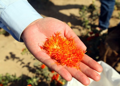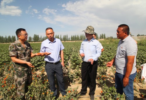 (台州援疆指挥部和一师九团领导、试验田种植户沟通红花种植情况)