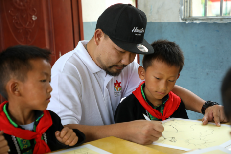 (“美好流动课堂”的专业美术导师在指导孩子们作画)