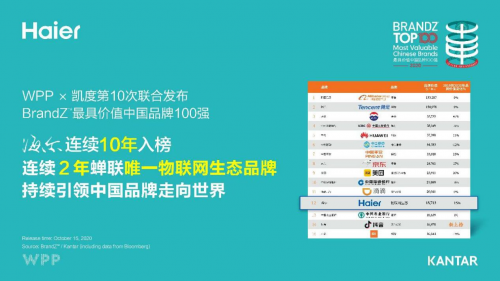 10月15日,上海,全球最大的品牌价值评估机构凯度发布了“2020年BrandZ最具价值中国品牌100强”榜单,并举行了BrandZ中国榜十周年特别纪念活动。现场海尔集团作为唯一的物联网生态品牌入榜,在榜单中位列12,排名持续提升。同时,海尔登顶2011-2020年品牌价值增长10强榜单,并荣获“全球首个物联网生态品牌奖”。