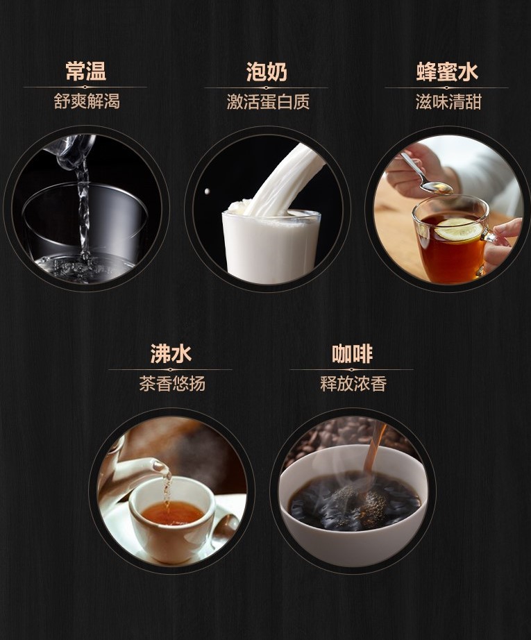 他人不懂的温度,美的悦家饮水机YR1908S-XY懂。5段专用水温,让用户可以一键选择,美的美居app自动匹配出水温度,精准可调每一度。无论是泡奶、泡蜂蜜水、泡茶、泡咖啡,都细致入微。