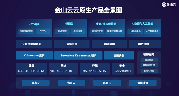 金山云面向混合云、多云场景下的容器服务,在多集群应用部署、跨集群服务治理、基础设施及集群管理方面进行了重点优化,来更好地帮助客户应对云原生转型时的挑战。容器服务支持单集群10000节点的超大规模部署,具备独立部署、托管和纳管集群、无服务器集群等多种服务形态,同时可实现上千节点秒级启动、分钟级快速扩容启动。此外,在多集群统一资源及统一流量治理的基础上,通过集成第三方CI/CD工具,实现应用的跨集群部署,助力企业云原生转型中的DevOps实践落地。