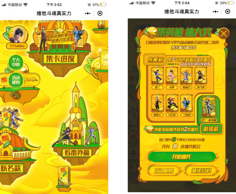 维他柠檬茶结合斗罗大陆动画中的史莱克七怪人物IP,推出3套主题共11款联名包装:常规款包装整箱购买,7款人物随机获得,而唐三个人彩蛋装还需要从指定彩箱中抽取,因“物以稀为贵”藏款获得的几率低,收集起来并不容易,有玩家将它当作艺术品来收藏。定制款包装更是纪念意义满分。每款包装上的小程序互动,集卡参与抽奖获得惊喜联名礼盒,礼盒中附送随机一款的七怪立牌和定制展架,实在是让“盲盒迷”、“收藏控”欲罢不能。