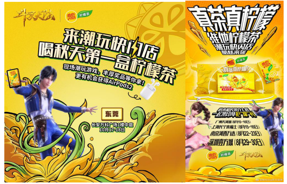 除了在线上和年轻消费者进行深入交流,维他柠檬茶还精心设计了【维他柠檬茶x斗罗大陆动画潮玩快闪店】线下活动,席卷全国核心商圈,强势登陆长沙松雅湖吾悦、杭州西溪银泰城,苏州中心,东莞长安万科。现场场景设计融合了大量的斗罗大陆动画元素,魂技魂环随处可见;设置联名礼盒中的定制展架同款打卡点,和史莱克七怪跨次元“同框”;还有闯关互动游戏。除了可以亲手定制属于自己的“出涩”纪念品(斗罗大陆动画主题帆布袋),还有机会领取其他时尚礼物,惊喜连连,吸引了大批斗罗大陆动画IP粉丝前往积极参与,为漫迷爱好者们提供了彼此交流的场所。