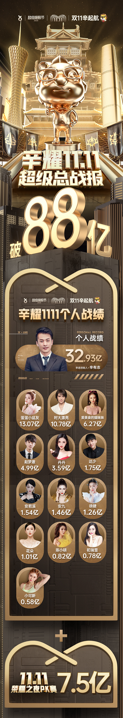 数据显示,除辛有志销售额达到32.93亿之外,蛋蛋小盆友、时大漂亮也实现了个人销售额破10亿大关。此前在11月1日的辛有志专场中,辛有志更是以18.8亿的亮丽战绩刷新了个人直播实际成交额的单场最高纪录。