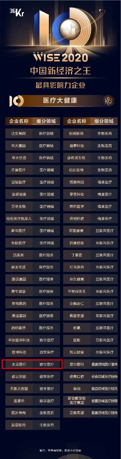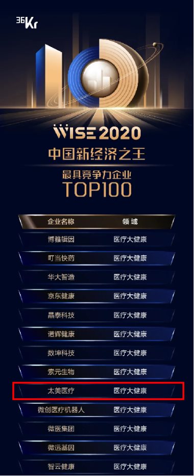 太美医疗科技凭借在医疗互联网领域的持续创新和专业技术研发能力,为行业各相关方开发并落地了诸多专业技术解决方案和创新服务,获得行业的广泛认可与好评,也形成了强劲的行业竞争力和高成长性。基于此,太美医疗科技荣登36氪WISE「2020年中国新经济之王最具竞争力企业」和「2020年中国新经济之王最具影响力企业」双料榜单。