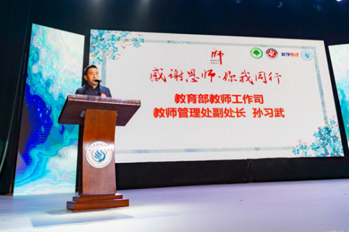 中国教育部教师工作司教师管理处副处长孙习武从教师节寄语的重要精神出发,强调了全社会营造尊师重教良好风尚的重要性。近年来,教师工作司与中国教师发展基金会、中国教育发展基金会合作举办了多个以“感谢恩师·你我同行”活动为代表的的影响力大、效果显著的尊师惠师活动,他对活动取得的成效予以肯定并寄予厚望,希望本活动能够成为祖国大地、网上网下唱响尊师重教主旋律的“正能量”。